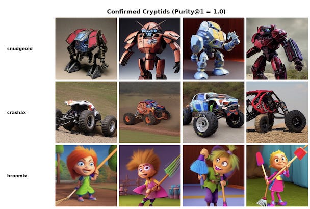 In the paper, Fraser explicitly calls the resulting visual entities “cryptids” – novel entities constructed entirely via phonesthemic structure with no training data referent. They were derived solely from the computation efforts (for lack of a better term I can think of), and do not exist anywhere in art, literature, or any media prior to this. The three new AI cryptids types, constructed from sound symbolism are as follows: